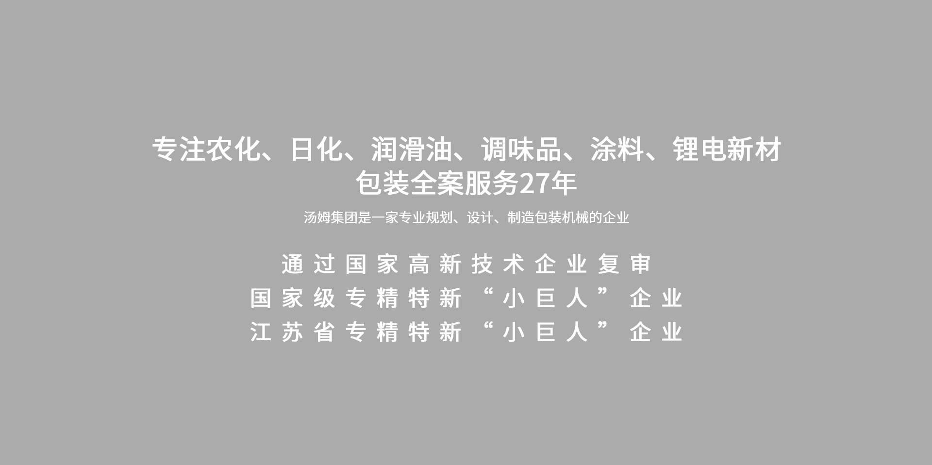 江蘇湯姆集團在液態、粉體、固體、顆粒等包裝領域的專長保證了工藝設計與整線工程的完美結合。建立了農化、石化、調味品、日化、涂料等不同包裝領域的工藝設計體系,根據不同的包裝形式及具體的工廠布局,均可提供專為您項目而量身定制的交鑰匙解決方案 。